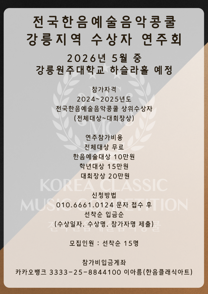 24~25' 전국한음예술음악콩쿨 강릉,제주 수상자연주회 참가자 모집 (제주지역마감)
